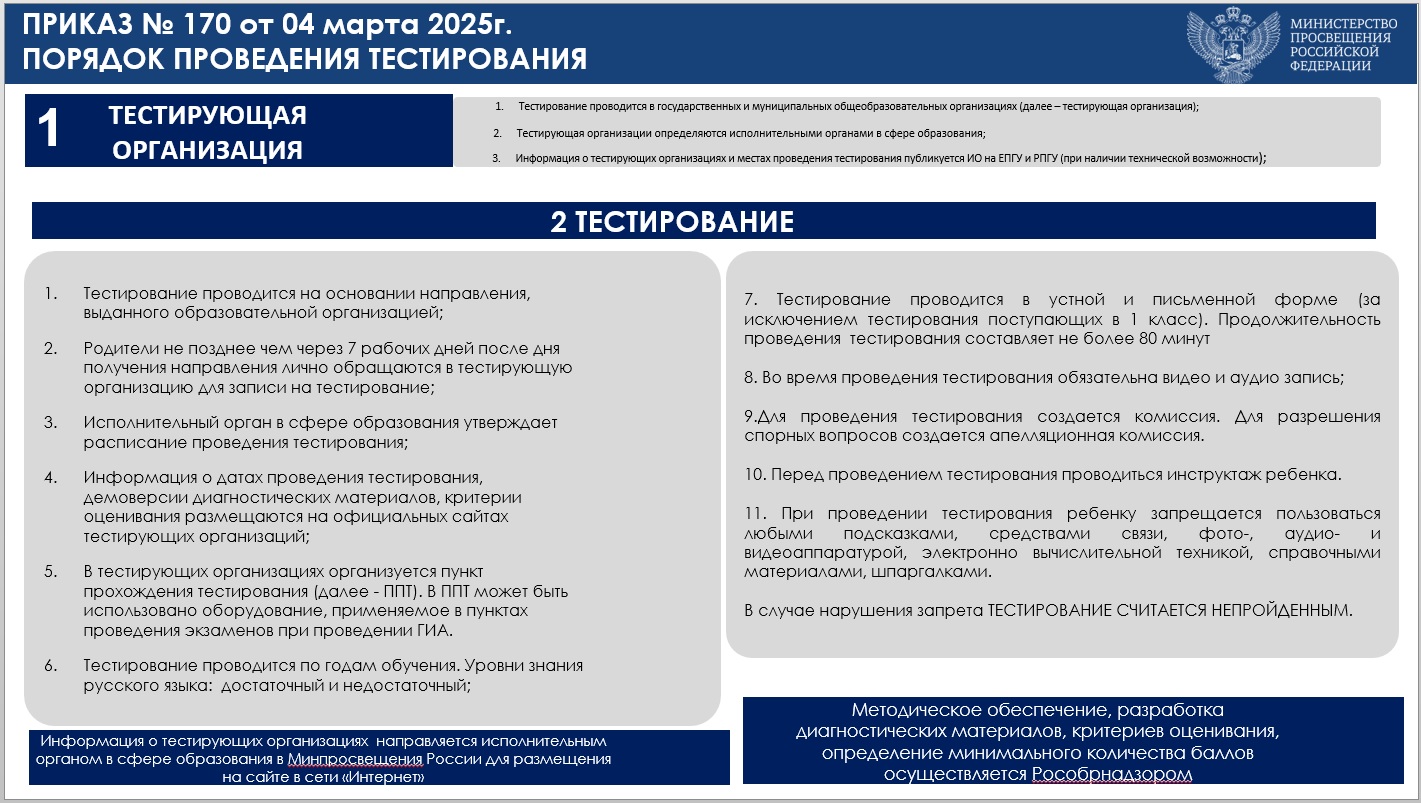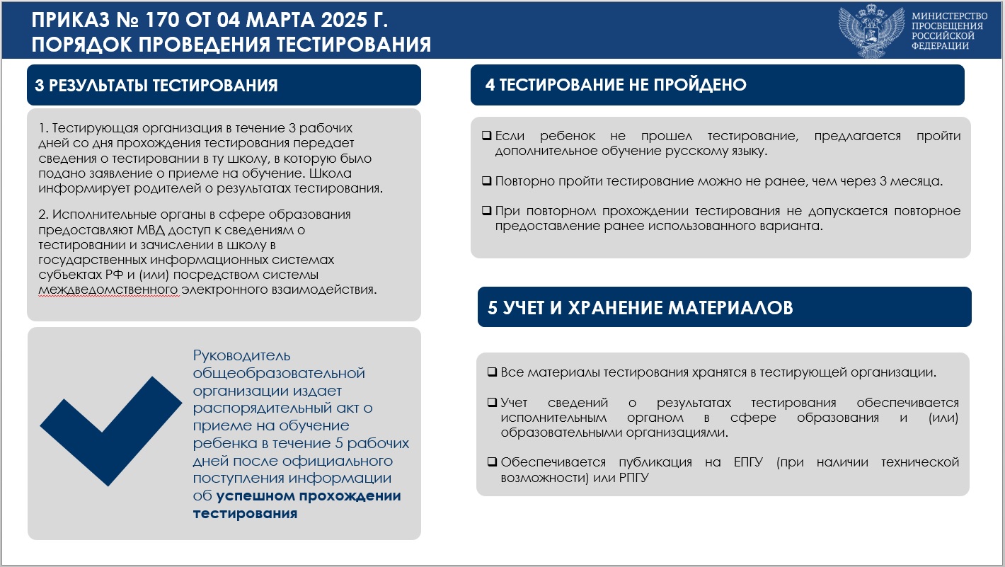 Приказ Минпросвещения России от 04.03.2025 № 170 "Об утверждении Порядка проведения в государственной или муниципальной общеобразовательной организации тестирования на знание русского языка, достаточное для освоения образовательных программ начального общего, основного общего и среднего общего образования, иностранных граждан и лиц без гражданства"